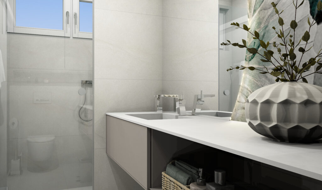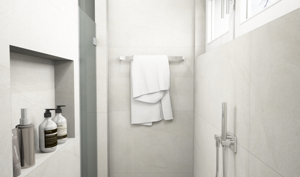 Wie wirkt ein kleines Bad, bevor die Renovierung startet? Genau dafür ist unsere 3D-Badplanung da. Dieses 5 qm Gästebad zeigt, wie sich ein länglicher Grundriss mit klarer Raumaufteilung, ruhigen Materialien und stimmungsvollem Licht großzügig anfühlen kann – perfekt als Inspiration für Ihre eigene 3D-Badgestaltung.