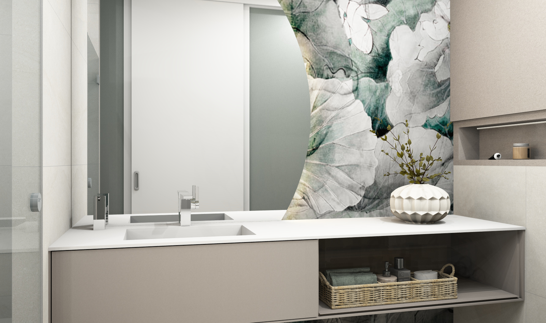 Der Zugang erfolgt über eine platzsparende Schiebetür. Beim Eintreten fällt der Blick direkt auf den Waschtischbereich: Helle, großformatige Flächen in cremigem Steinfarbton lassen den Raum weit wirken – und das florale Wandhighlight setzt bewusst einen weichen Kontrast zur reduzierten Linienführung.