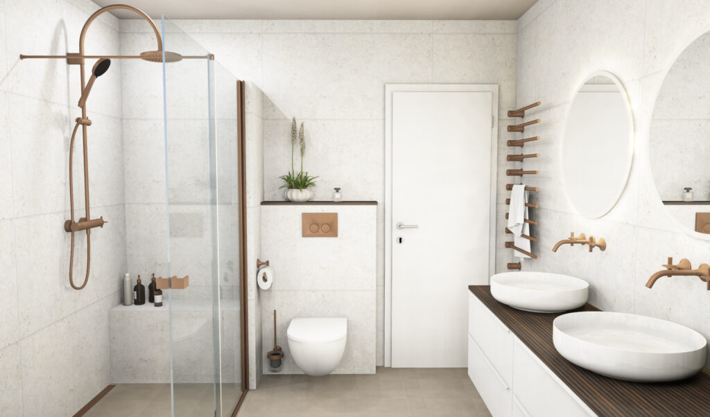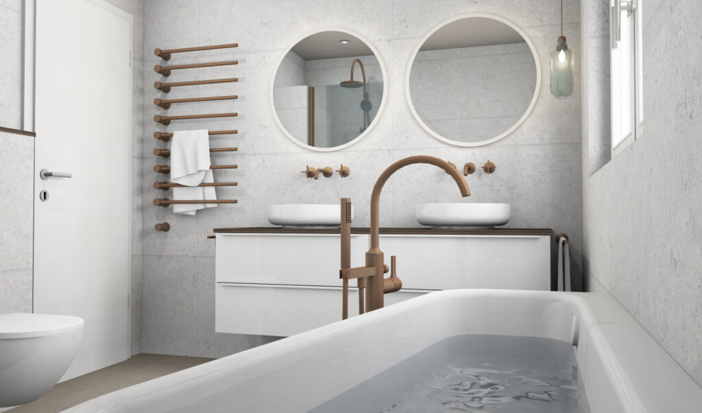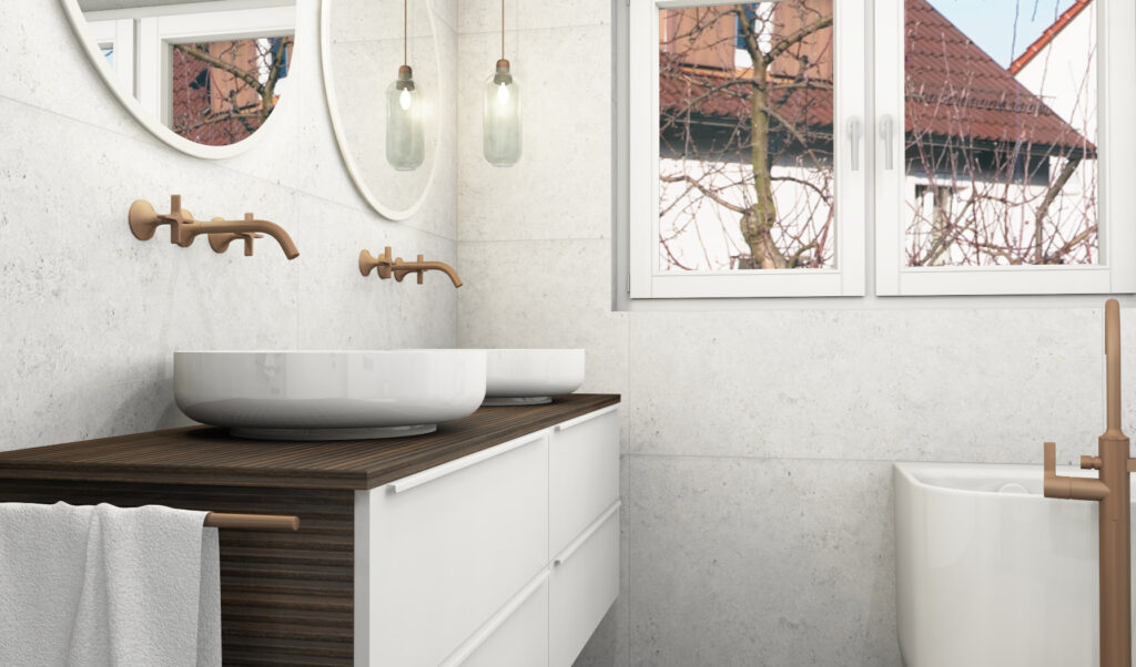 Entlang der Fensterseite wurde eine komfortable Raumsparwanne mit freistehender Armatur geplant, die die Wandlänge optimal nutzt. Armaturen, Accessoires und Duschprofil sind in Bronze gebürstet ausgeführt und setzen warme, hochwertige Akzente, die perfekt mit der dunklen Holzplatte und den großformatigen Bodenfliesen harmonieren. Ein stylischer elektrischer Heizkörper sorgt jederzeit für warme Handtücher.