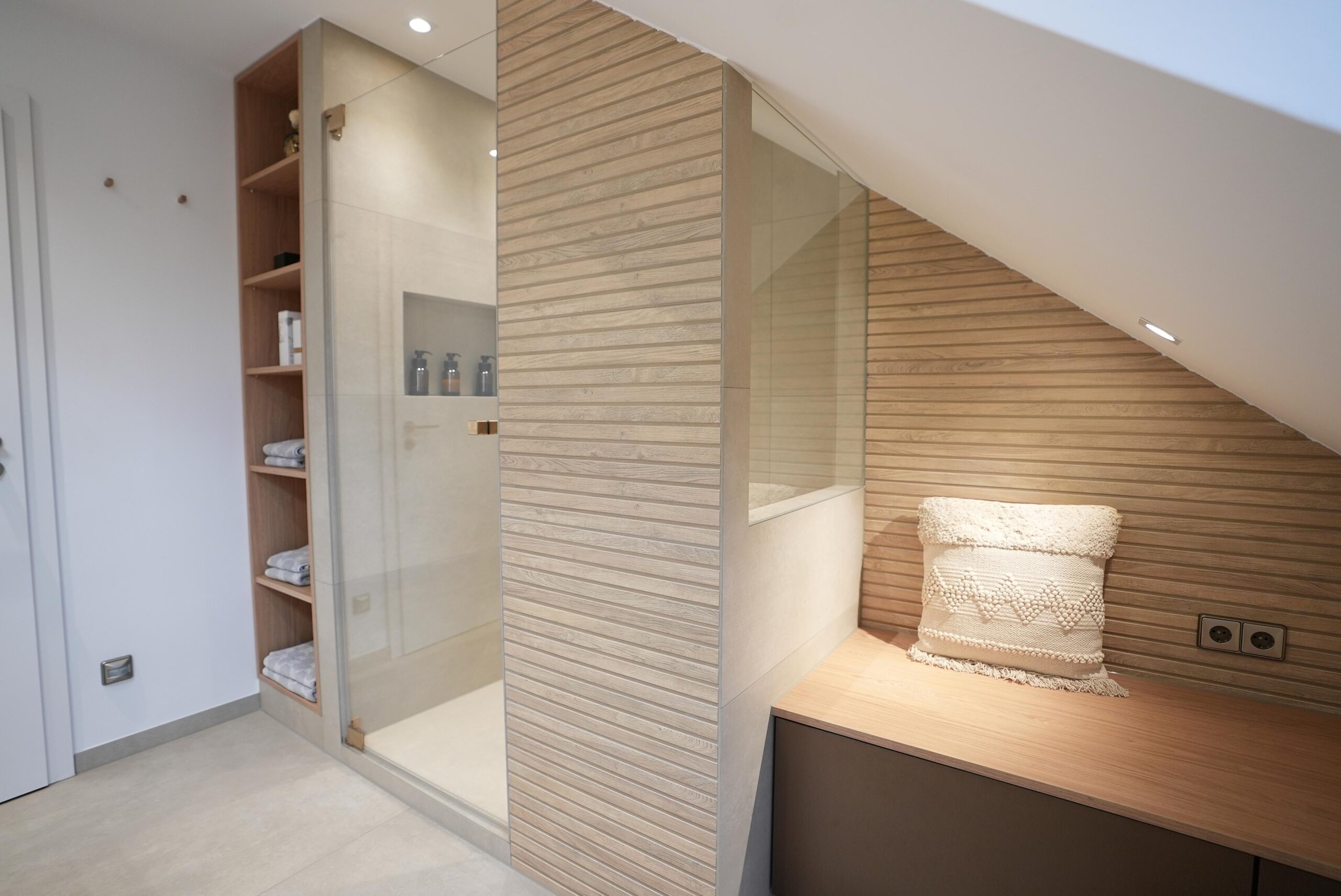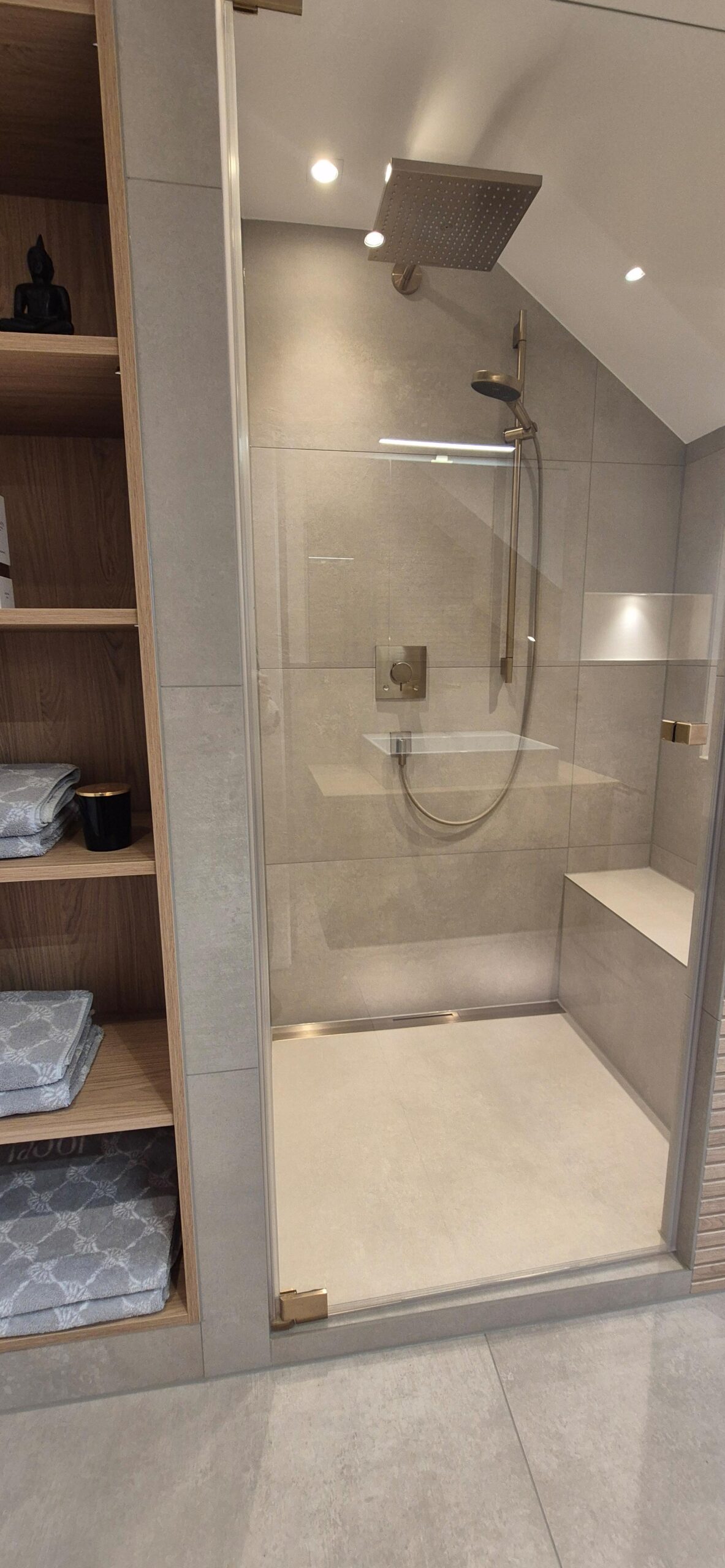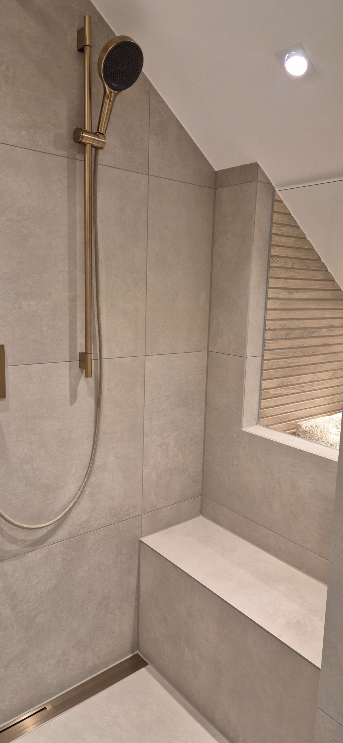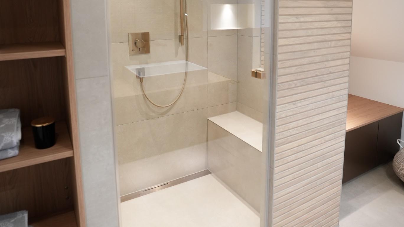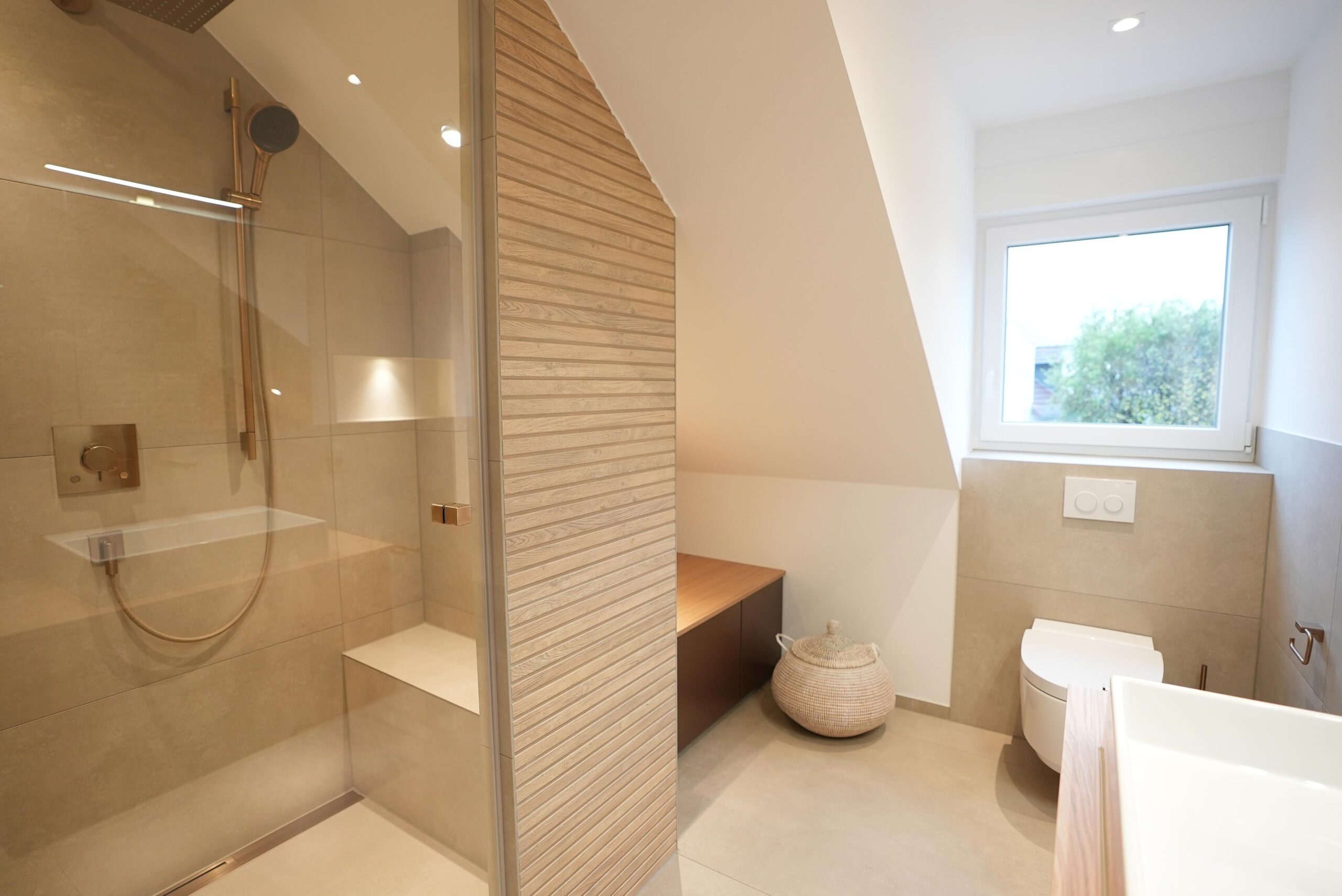 Dieses 7,5-m²-Badezimmer unter der Dachschräge zeigt, wie eine moderne Badezimmer-Renovierung in Mainz gleichzeitig stilvoll und alltagstauglich wird. Highlights sind die durchgängig abgestimmten Armaturen in Brushed Bronze, eine klare Linienführung mit warmen Cremetönen sowie smarte Stauraumlösungen rund um Dusche, Waschtisch und WC.
