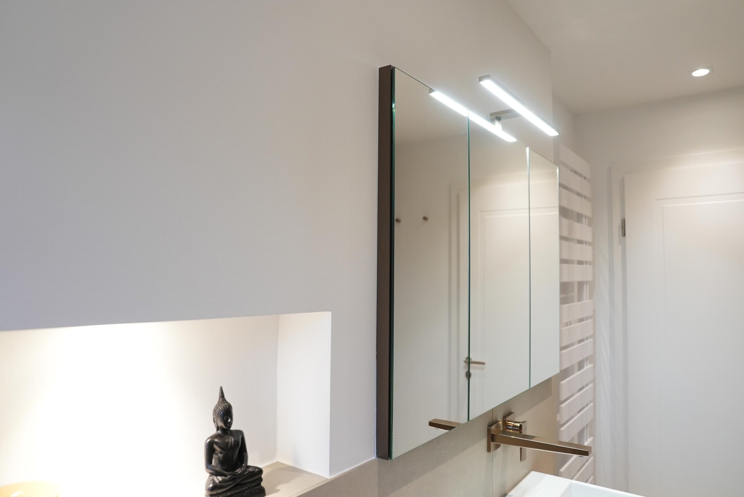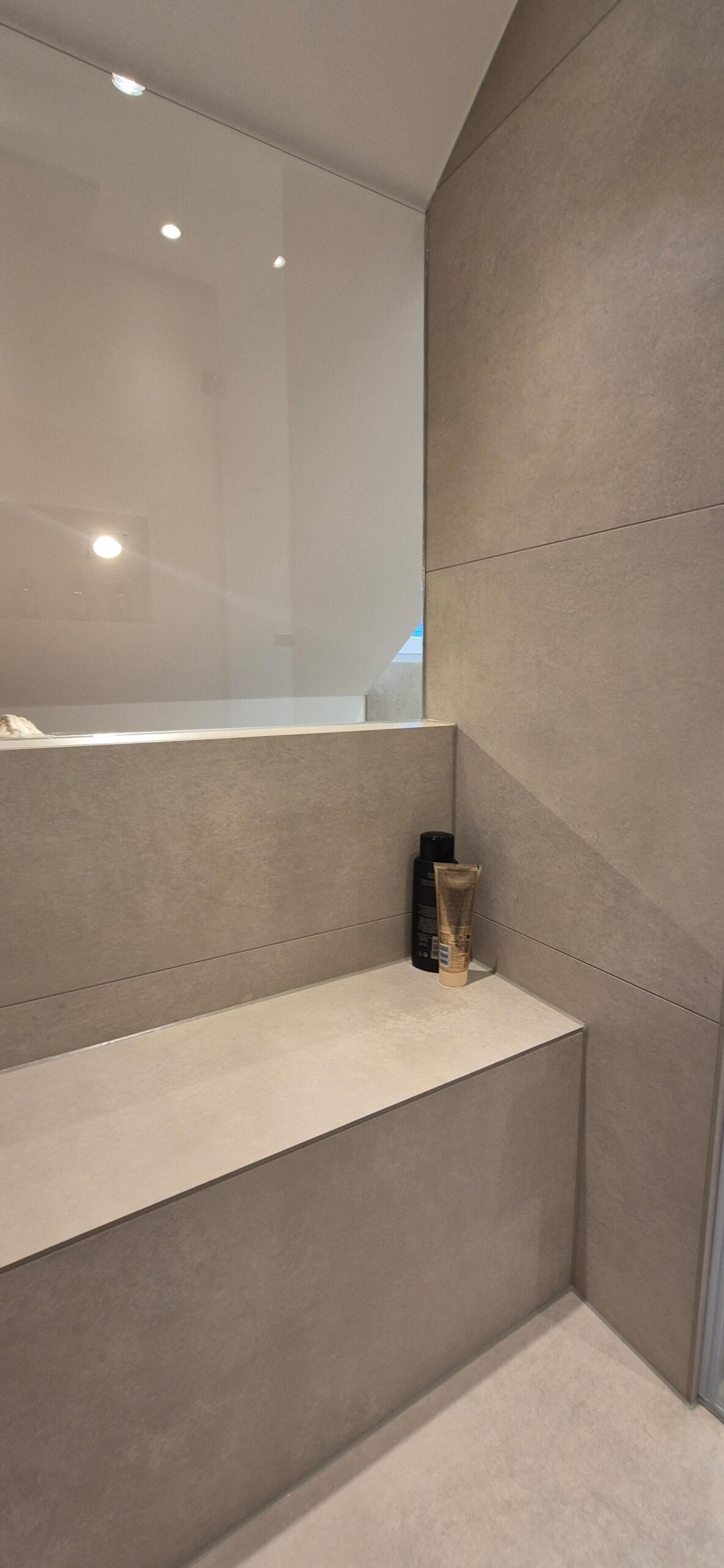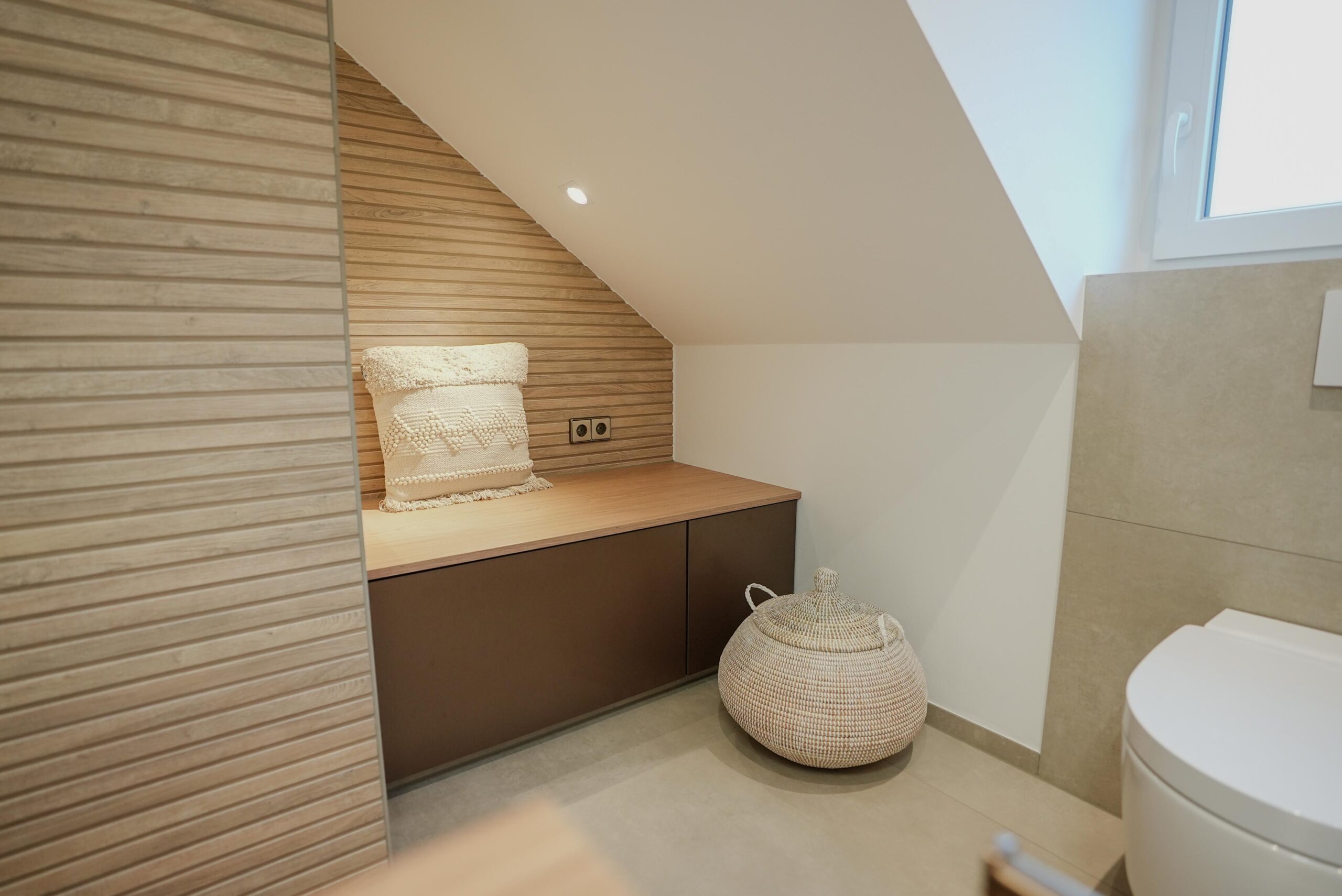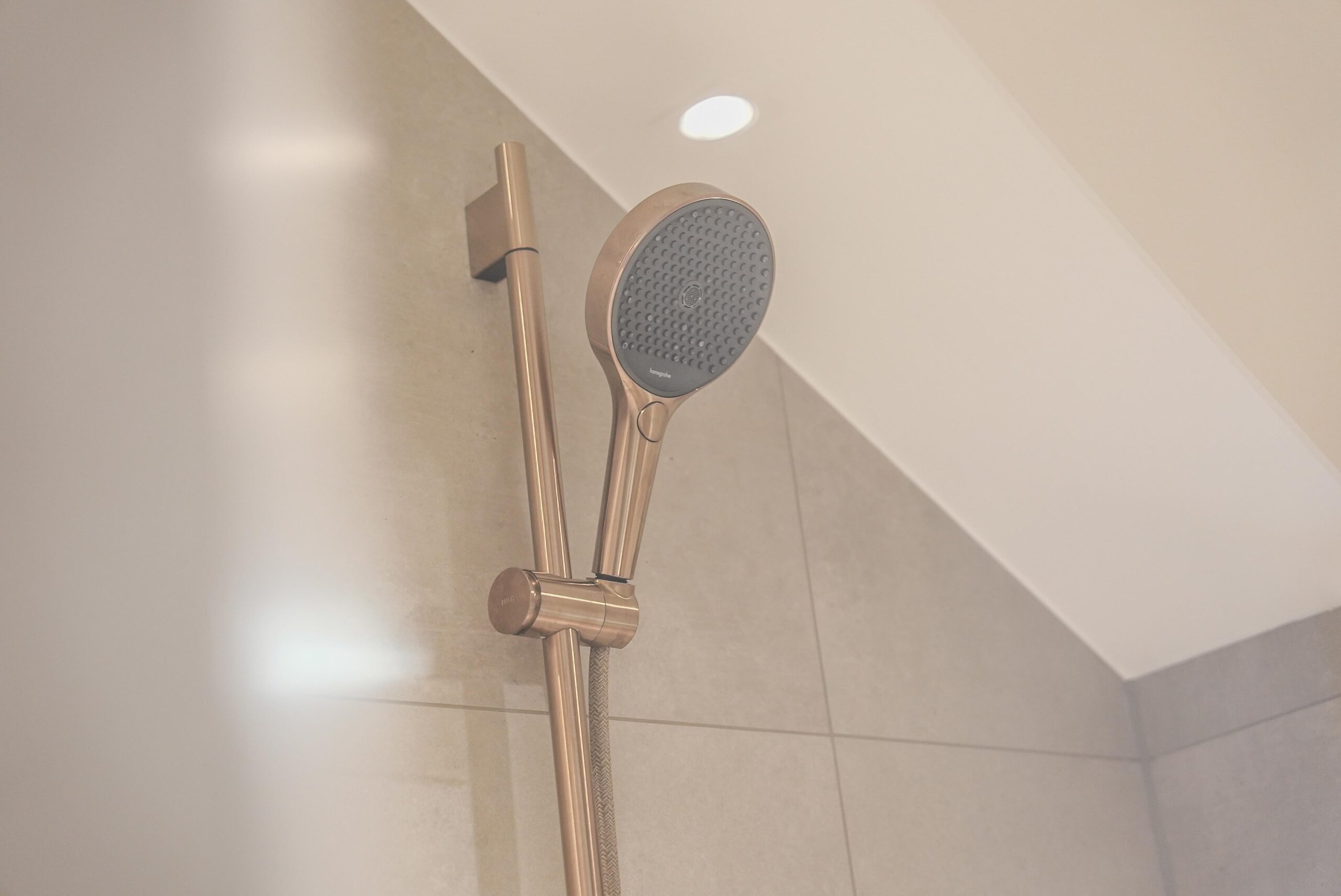 Dieses 7,5-m²-Badezimmer unter der Dachschräge zeigt, wie eine moderne Badezimmer-Renovierung in Mainz gleichzeitig stilvoll und alltagstauglich wird. Highlights sind die durchgängig abgestimmten Armaturen in Brushed Bronze, eine klare Linienführung mit warmen Cremetönen sowie smarte Stauraumlösungen rund um Dusche, Waschtisch und WC.