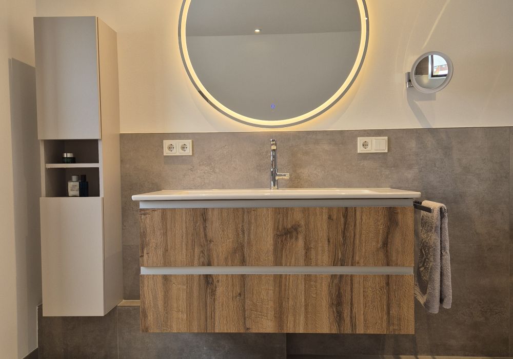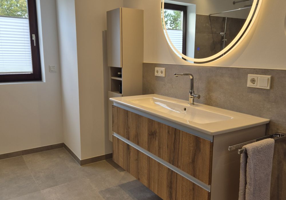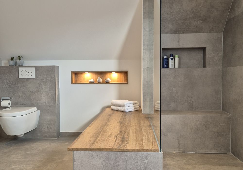 Dieses stilvolle Badezimmer auf 10 Quadratmetern bietet ein harmonisches Zusammenspiel aus modernem Design und entspannendem Komfort. Ein hochwertiger, moderner Spiegel mit integrierter Beleuchtung setzt einen eleganten Akzent, während die beleuchtete Nische in der Wand eine edel anmutende Atmosphäre schafft.
