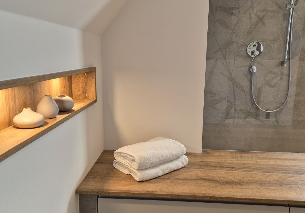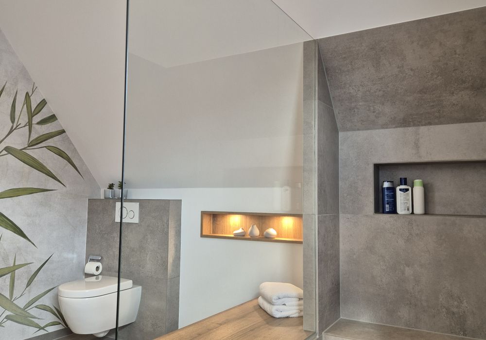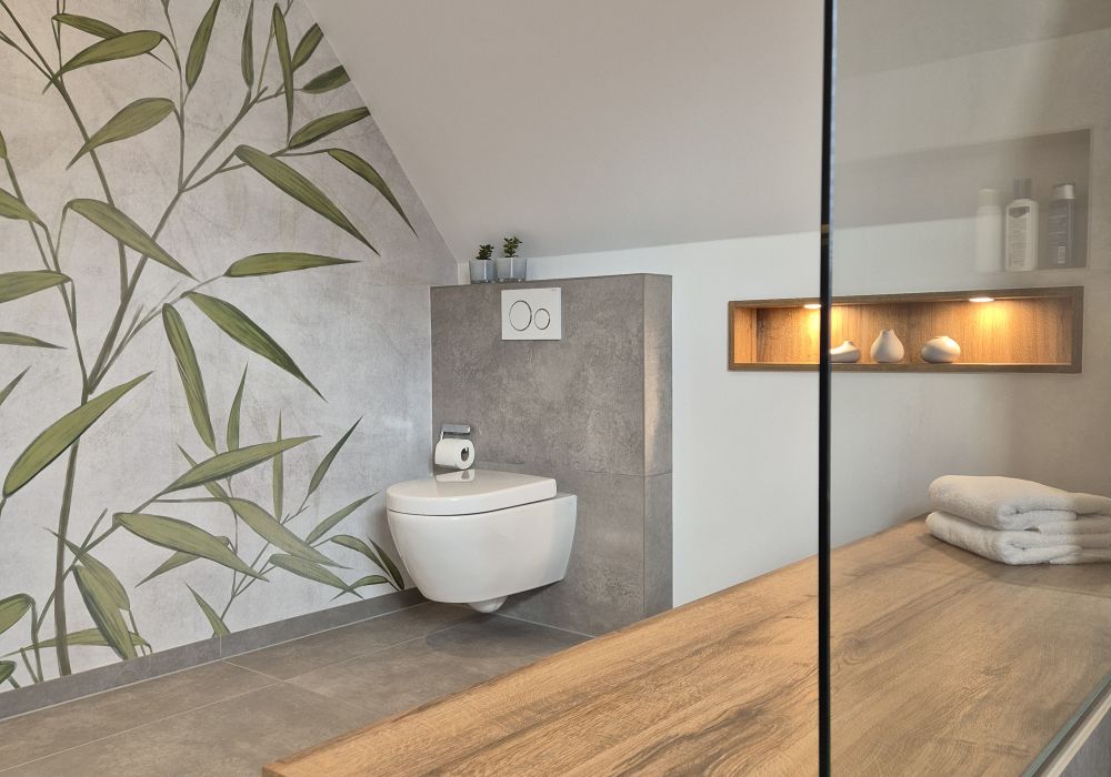 Der Sitzbereich direkt neben der offenen Dusche mit Glaswänden und einer Regendusche lädt zum Entspannen und Genießen ein. Eine hochwertige Tapete mit floralem, unaufdringlichem Muster ergänzt das Gesamtbild und fügt sich nahtlos in das Ambiente des Raumes ein. Die Dusche ist außerdem ausgestattet mit einer praktischen Sitzoption und einer integrierten Nische für Badutensilien. Der moderne Waschtisch mit Holzfront bietet zusätzliche Stauraum und sorgt für Ordnung im Bad.