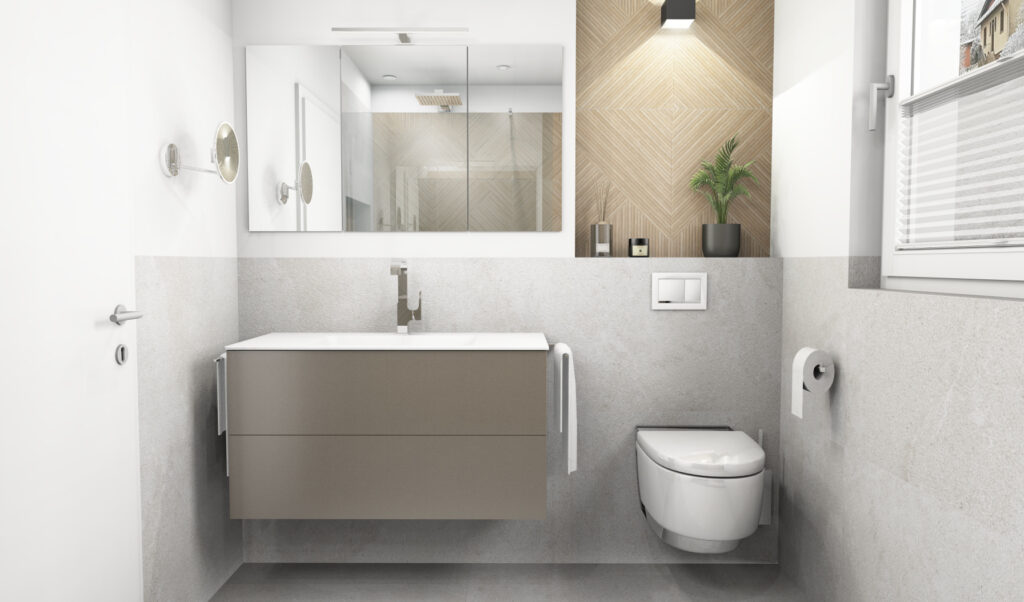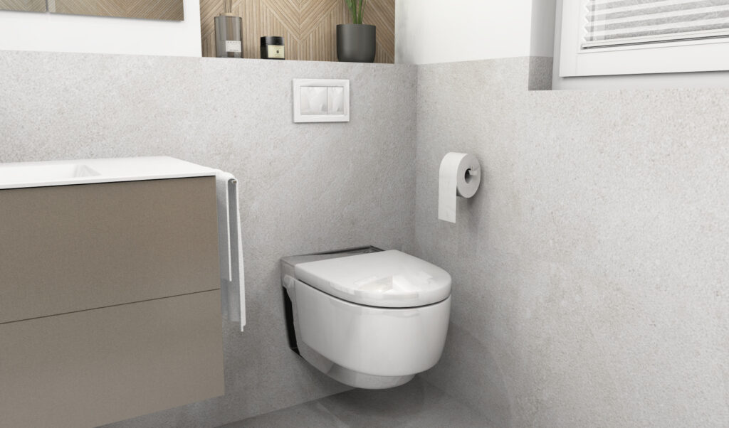 Das eingeplante Dusch-WC sorgt für mehr Hygiene und Bequemlichkeit – besonders sinnvoll, wenn das Bad langfristig komfortabel nutzbar sein soll. Die wandhängende Montage unterstützt die klare Linienführung der Badgestaltung und lässt den Boden frei.