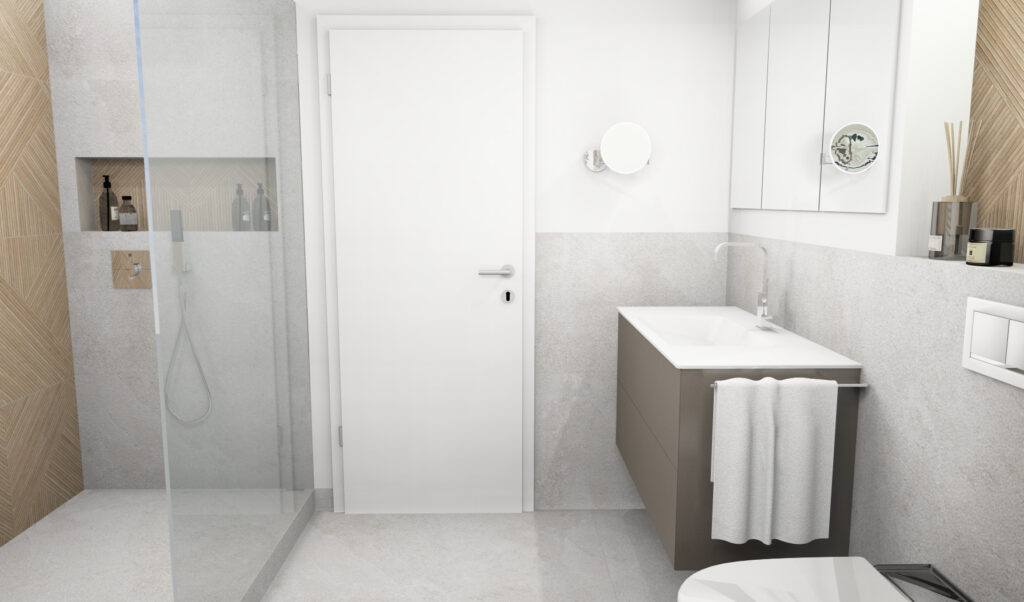 Der Spiegelschrank ist als Einbauspiegelschrank in die Wand geplant – so bleibt die Front bündig und ruhig. Eine Aufbauleuchte sorgt für gleichmäßiges Licht am Waschtisch; über dem WC ergänzt eine Wandleuchte indirektes Licht für Atmosphäre am Abend. Ein schlanker Design-Heizkörper dient zugleich als Handtuchwärmer – praktisch und platzsparend.