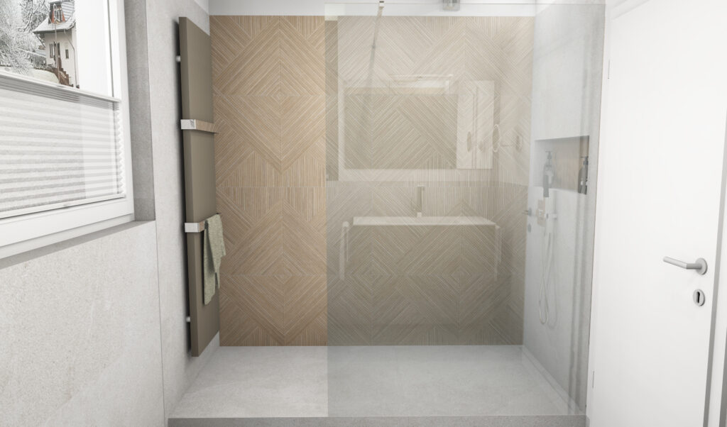 Highlight ist die geflieste Walk-in Dusche mit einer großflächigen Wand in Holzoptik – dieses warme Materialbild zieht sich auch in den Bereich über dem WC und verbindet die Zonen zu einem stimmigen Konzept. Eine feste Glas-Duschtrennwand hält Spritzwasser zurück, ohne den Raum zu schließen. In der Dusche ist zudem eine praktische Nische integriert: Shampoo und Duschgel sind griffbereit, aber elegant verstaut.