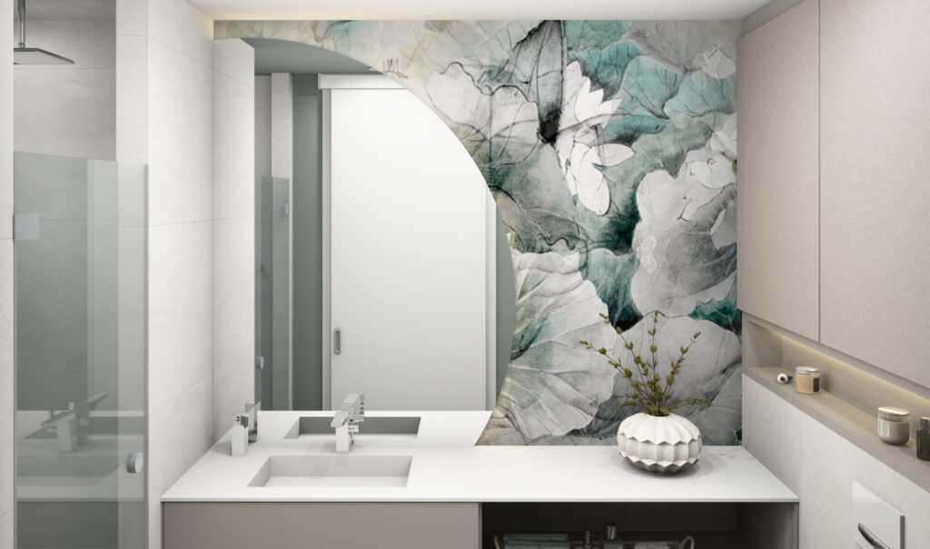 5 m² Gästebad: Corian-Waschtisch, florales Statement & ebenerdige Dusche in 3D